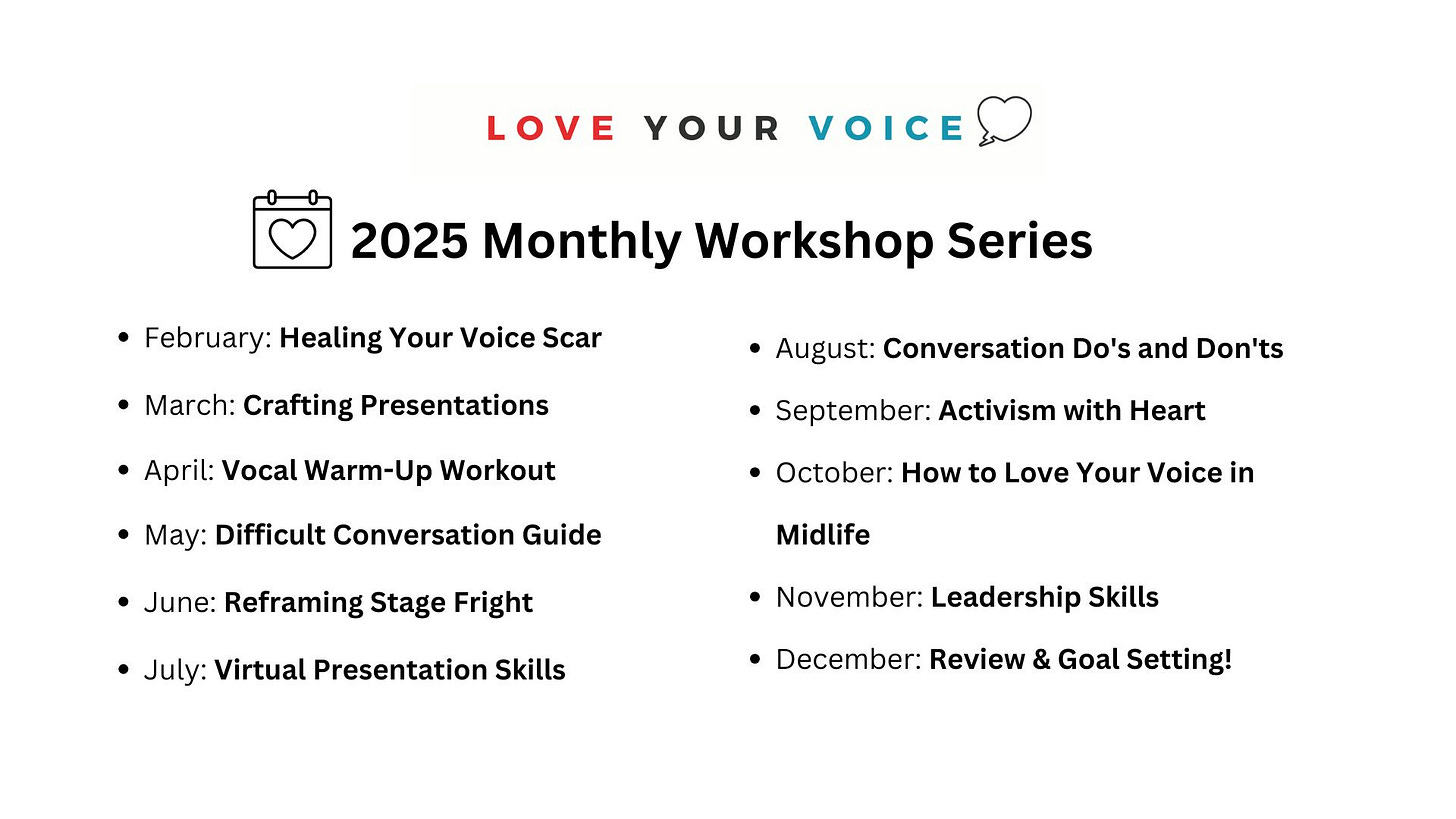 Love Your Voice is a coaching community for midlife women where we explore ways to help you communicate with greater confidence and self-expression.