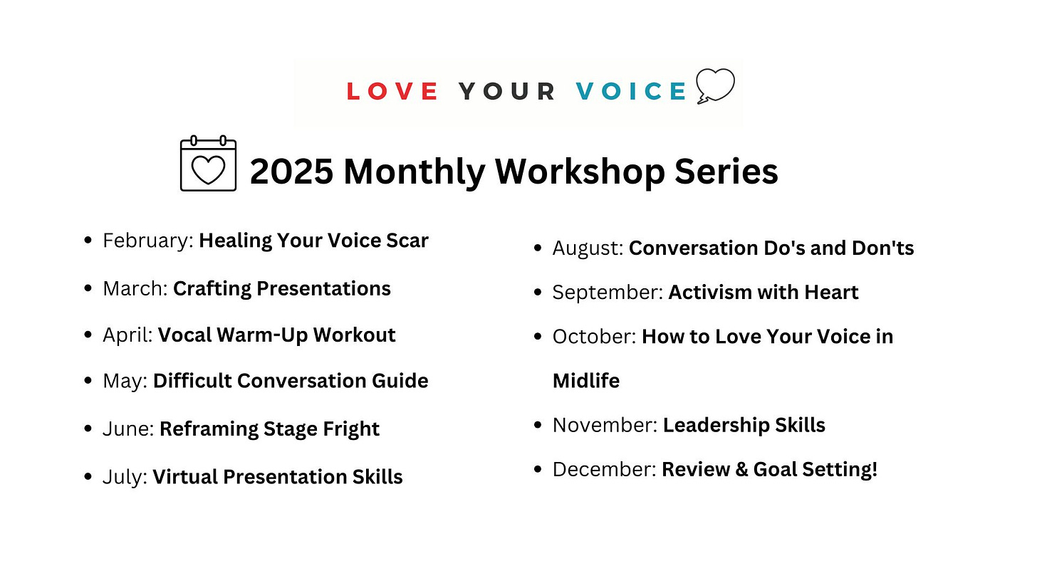 Each workshop includes a different skill set to help you strengthen your voice and confidence, empowering you to speak your mind every time! The complete workshop series is available to annual paid subscribers.